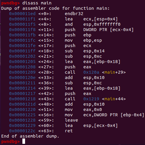 - disass main : 실행시킨 프로그램 안의 main 함수를 assembly code로 나타내줌.