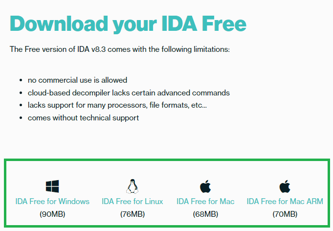 필자는 윈도우 운영체제를 사용하기 때문에, IDA Free for Windows를 통해 다운받았다.