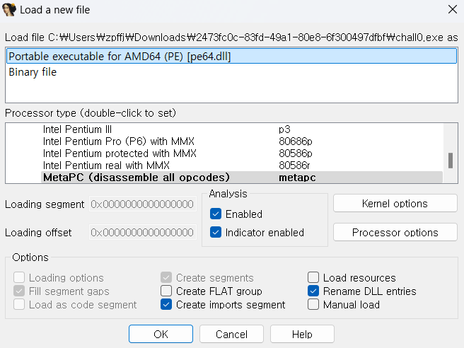 위의 사진은 IDA 실행 후, New 버튼을 통해 파일을 로드하고자 한 상황이다.