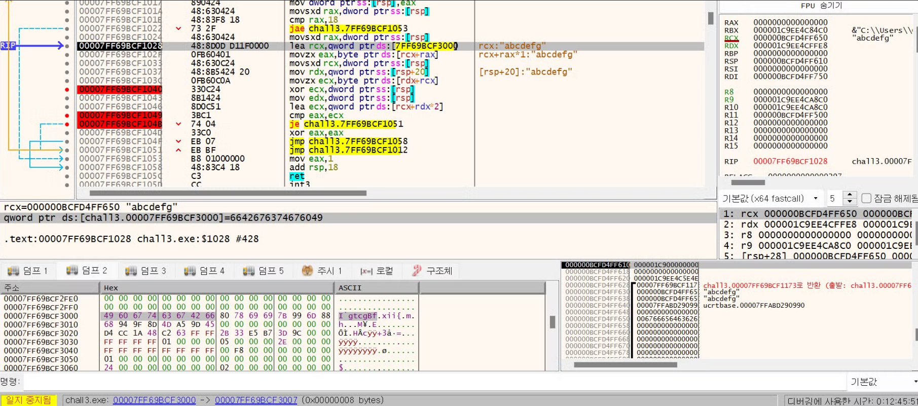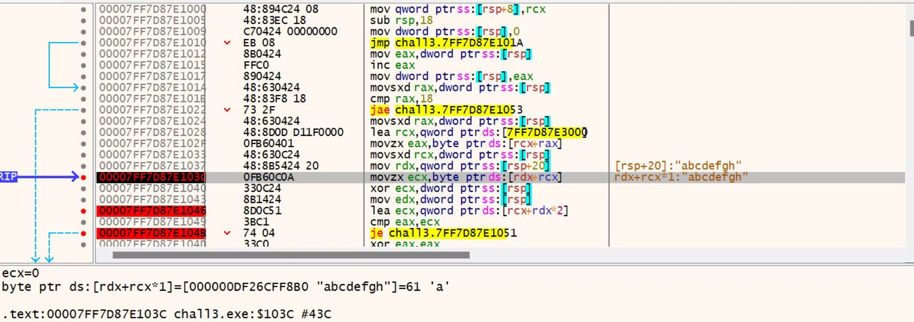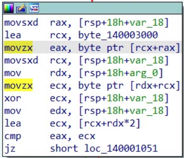 xor 연산 후 rsp 값(0,1,2,3,4,5,6,7,8,9,A,B,C,D,E,F,10,11,12,13,14,15,16,17)을 edx 레지스터로 옮긴 후 *2를 한 후 xor 연산 값과 더하여 메모리 안에 플래그 값과 비교한다.