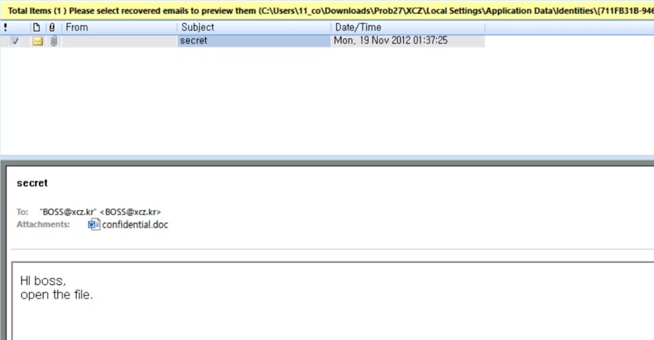 outbox.dbx 파일을 열어 확인해보니 처음의 Recent 폴더에서 기밀문서라고 생각했던 Confidential.doc 파일을 주고받은 것을 확인할 수 있었다. 툴 기능을 활용해 outbox.dbx 파일을 eml 파일로 추출했고 해당 eml 파일을 Outlook으로 열었다.