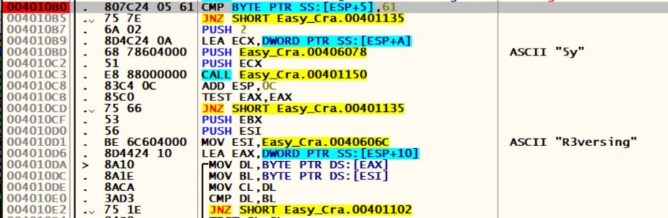 004010B0를 보면 ESP+5에 있는 값과 61(Hex 'a')를 비교한다.