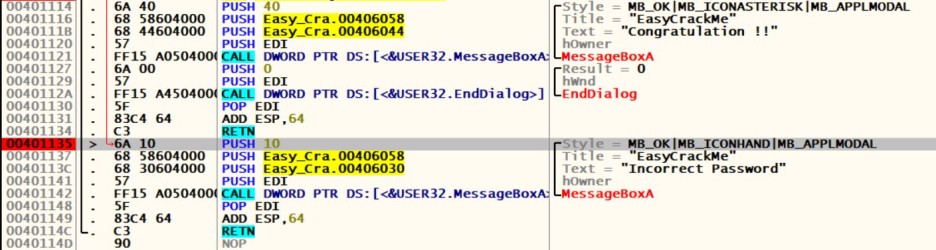 00401135에 Break Point(단축키 F2)를 걸어 Incorrect Password로 점프하지 못하게 한다.