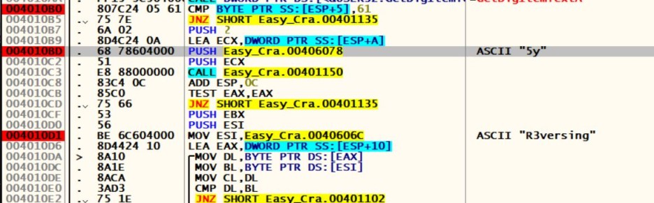004010D1 부터 다섯 번째 글자부터 끝까지 'R3versing'과 비교를 한다.