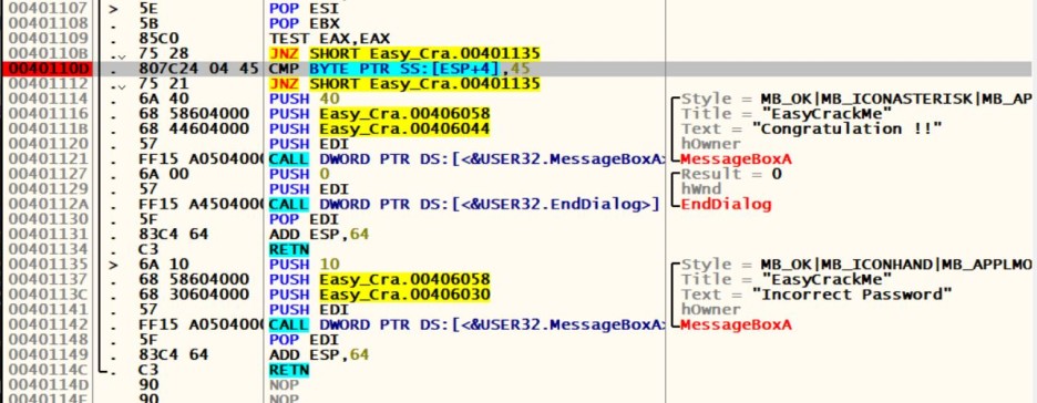 0040110D에서 ESP+4인 첫 번째 글자와 45(Hex 'E')를 비교한다.