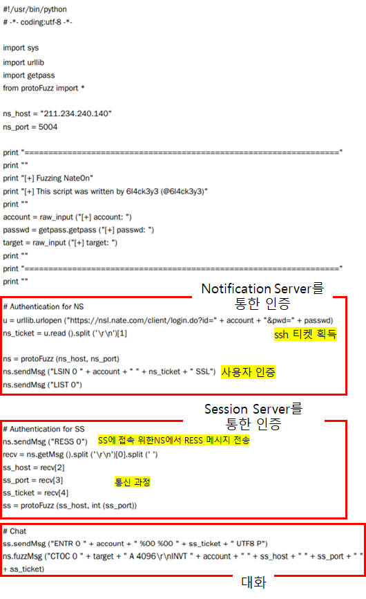 • 네이트온 프로토콜을 바탕으로 whitespace나 “\r\n” 등을 기준으로 메시지 내용을 쪼개어서 각 데이터에 에러가 발생할만한 쓰레기 데이터를 삽입하는 방법을 이용하는 예