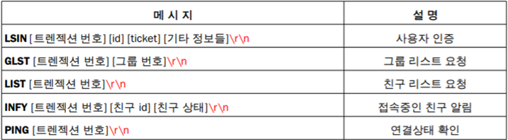 • 사용자 인증, 그룹/친구 리스트 요청, 접속중인 친구 알림, 연결상태 확인