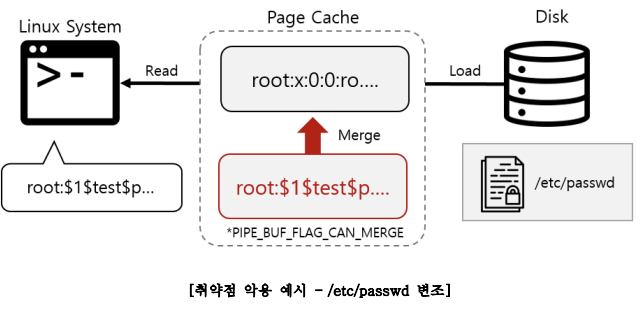 Page Cache는 디스크와 메모리 간의 데이터 교환을 효율적으로 하기 위해 사용되는 캐시로, 리눅스에서 사용됨. 그러므로, Page Cache 을 변조하게 되면 시스템이 변조된 파일을 읽어오게 됨.