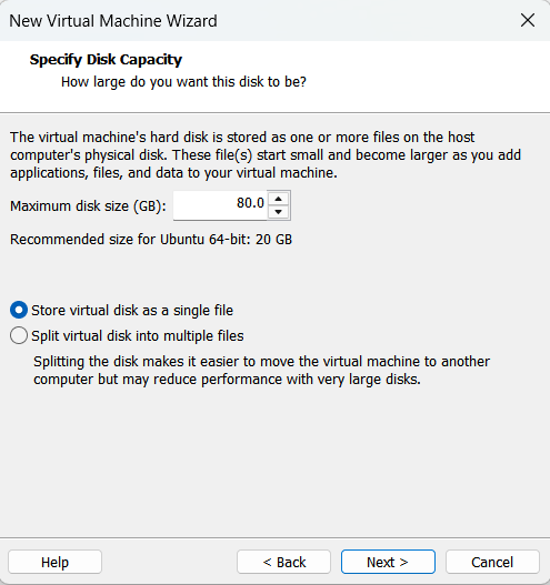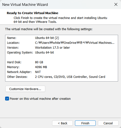머신의 용량을 설정해야 합니다. 추천은 20GB라고 나와있지만 여유가 된다면 80GB는 설정하는 것을 추천드립니다. 설정 후 아래의 'Store virtual disk as a single file'을 선택합니다. 사용엔 크게 차이가 없지만, single file로 설치하는 것이 조금 더 좋은 성능을 냅니다. Next를 눌러주면 우리가 방금 설정했던 것+다른 추가 하드웨어 설정하는 창이 나옵니다. 디폴트로 설정해도 우리가 이용하는데에는 문제가 없기에 그냥 Finish를 눌러 설정을 완료해주면 머신이 자동으로 설치됩니다.