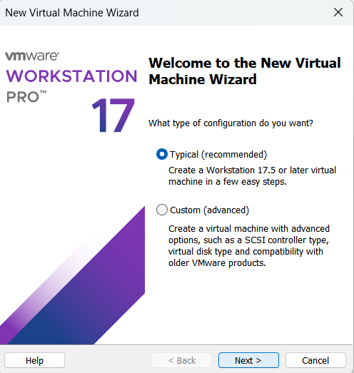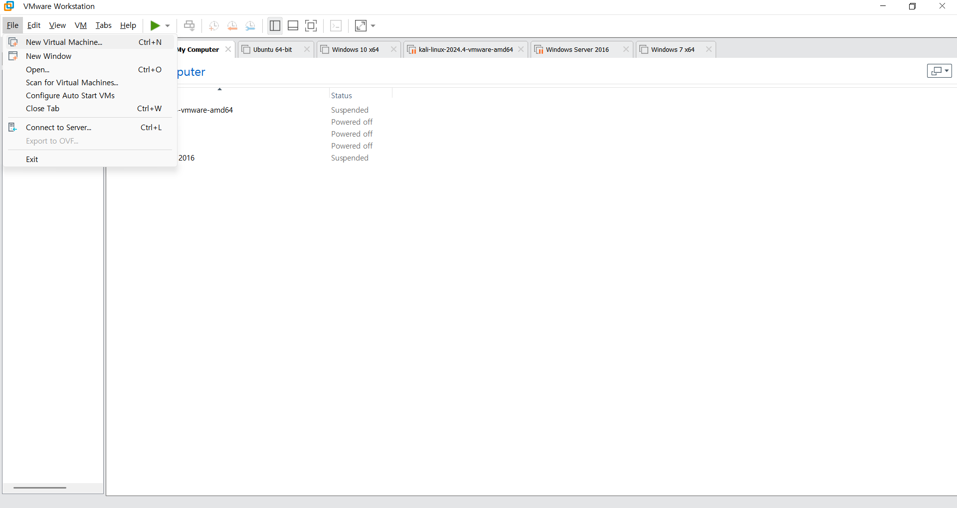 vmware를 실행시켜줍니다. 처음 설치한 머신일 경우 메인 화면에 create new virtual machine을 선택해주시면 됩니다. 이전에 만든 머신이 있을 경우 좌측 상단에 File>New Virtual Machine을 눌러줍니다.