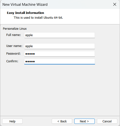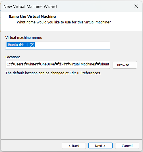 머신에서 사용할 계정의 id, pw를 설정해줍니다.본인이 기억하기만 하면 어떤 것으로 설정해도 상관 없습니다. 계정을 만들고 next를 눌러주면 우분투 이름과 경로를 설정할 수 있는 창이 나옵니다. vmware를 사용하며 쓰게 되는 용량이 상당하므로 남은 용량이 큰 곳에다 설치하는 것을 추천합니다.