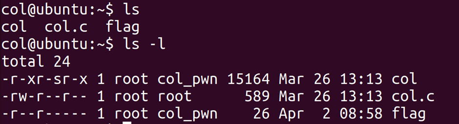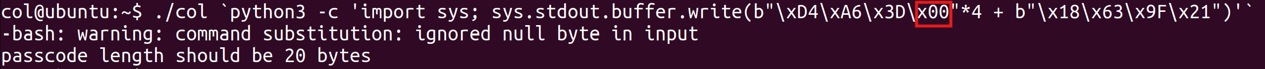 ./col `python3 -c 'import sys; sys.stdout.buffer.write(b"\xC8\xCE\xC5\x06"*4 + b"\xCC\xCE\xC5\x06")'`