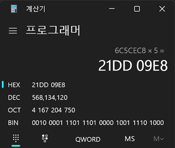 0x21DD09EC를 5로 나눈 값은 6C5CEC8임