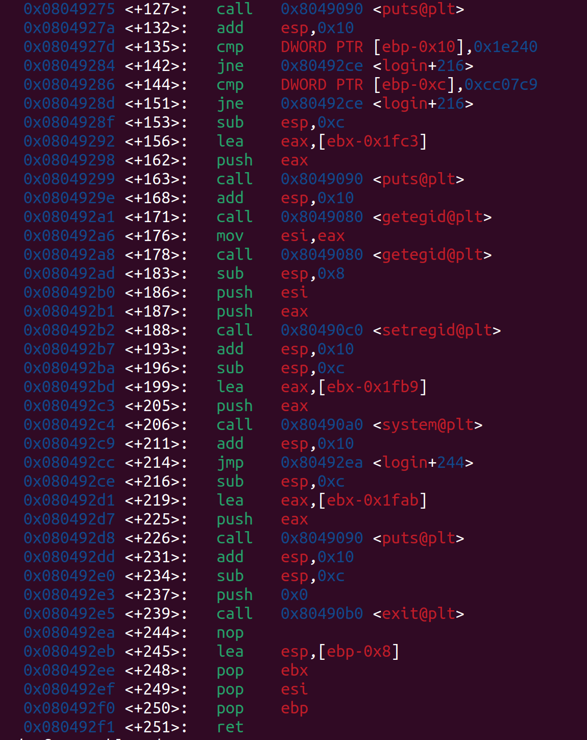 login 함수를 자세히 비교하기 위해 disass login 명령어 입력