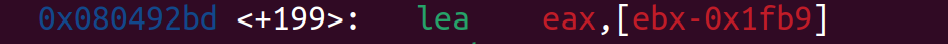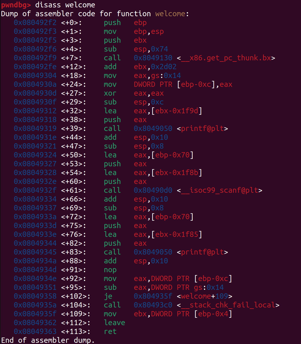 <welcome+54> 구간의 lea eax, [ebx=0x1f8b]는 출력할 문자열의 주소를 나타냄