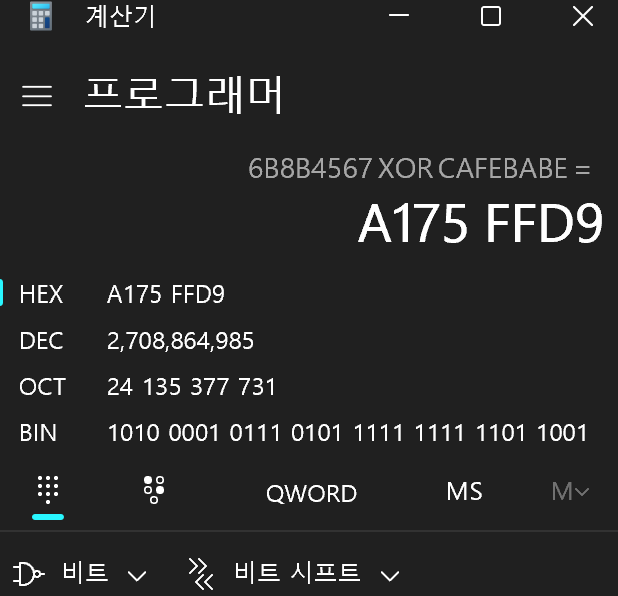 key 값과 random 값을 XOR 연산을 취해 0xcafebabe가 나와야 함