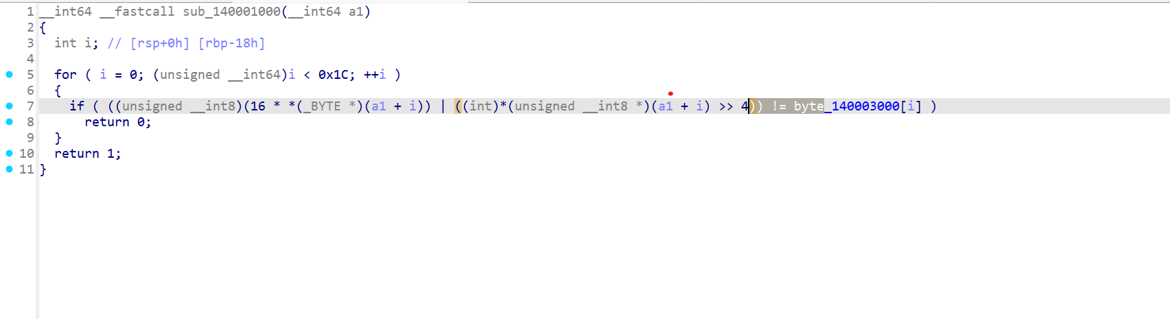 - 주어진 28바이트는 기준값 (byte_140003000[])이고, 역산하면 원래의 x값을 일부 구할 수 있다