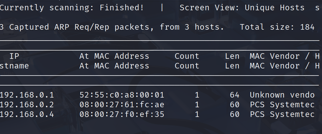 sudo netdiscover -i eth0 -r 192.168.0.0/24