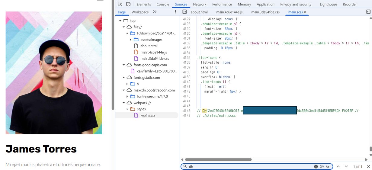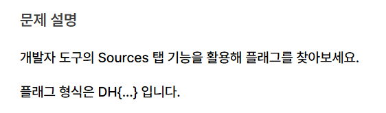개발자 도구 Sources 탭에서 dh를 검색해 봤더니 플래그가 나와 있음