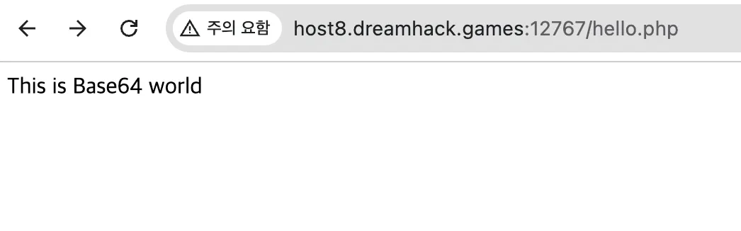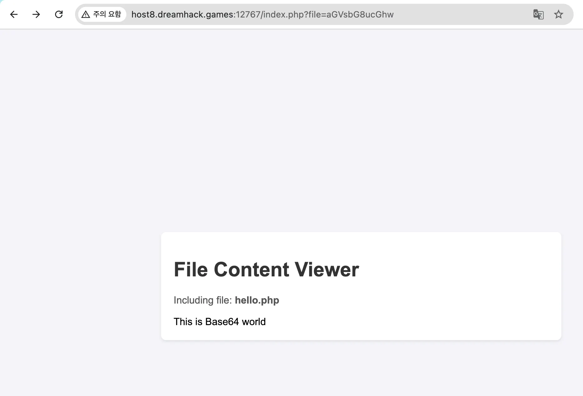 이를 통해 php를 넘겨주면 안의 내용을 출력해준다는 것을 알았고, 두 번째 시도에서 index.php의 파일 파라미터에 hello.php를 base64 인코딩한 형태로 넣어줘도 hello.php가 출력됨을 확인