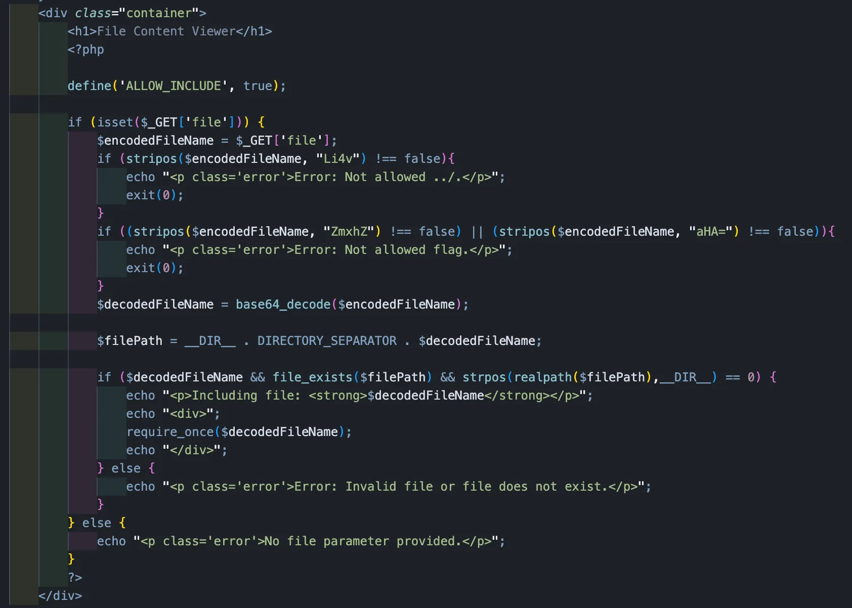 index.php를 확인해보니 파일을 get으로 받아서 ../과 flag.php를 base64 인코딩 형태로 필터링 하는 것을 알 수 있었음.