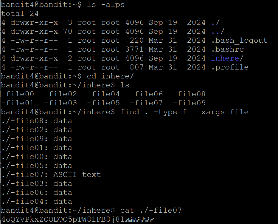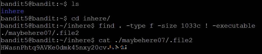 이 레벨의 비밀번호는 inhere 디렉토리 아래 어딘가에 있는 파일에 저장되어 있으며 , 다음의 모든 속성을 가짐