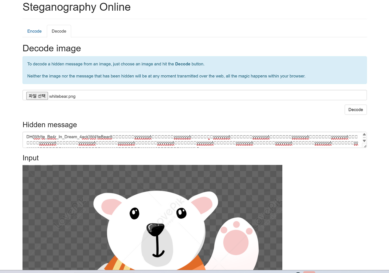 steganogragpy라는 앱에서 whitebear이라는 사진을 decode하였다.