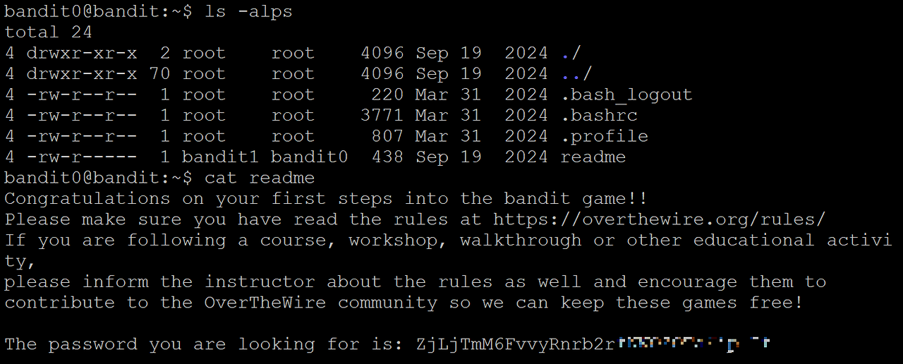 --> readme 파일의 내용을 cat하고 다음 레벨의 비밀번호 얻어야 함