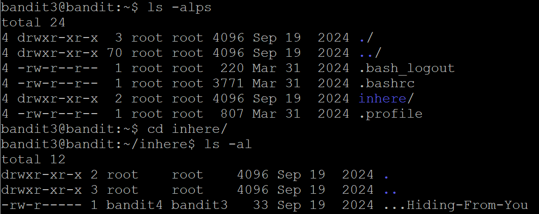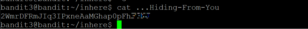다음 레벨의 비밀번호는 inhere 디렉토리 의 숨겨진 파일에 저장되어 있음