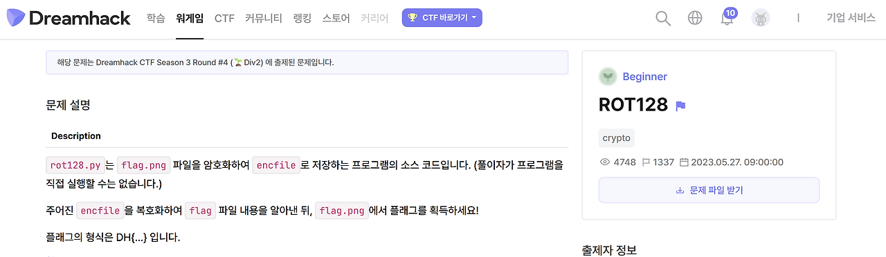 Descriptionrot128.py는 flag.png 파일을 암호화하여 encfile로 저장하는 프로그램의 소스 코드입니다. (풀이자가 프로그램을 직접 실행할 수는 없습니다.)주어진 encfile을 복호화하여 flag 파일 내용을 알아
