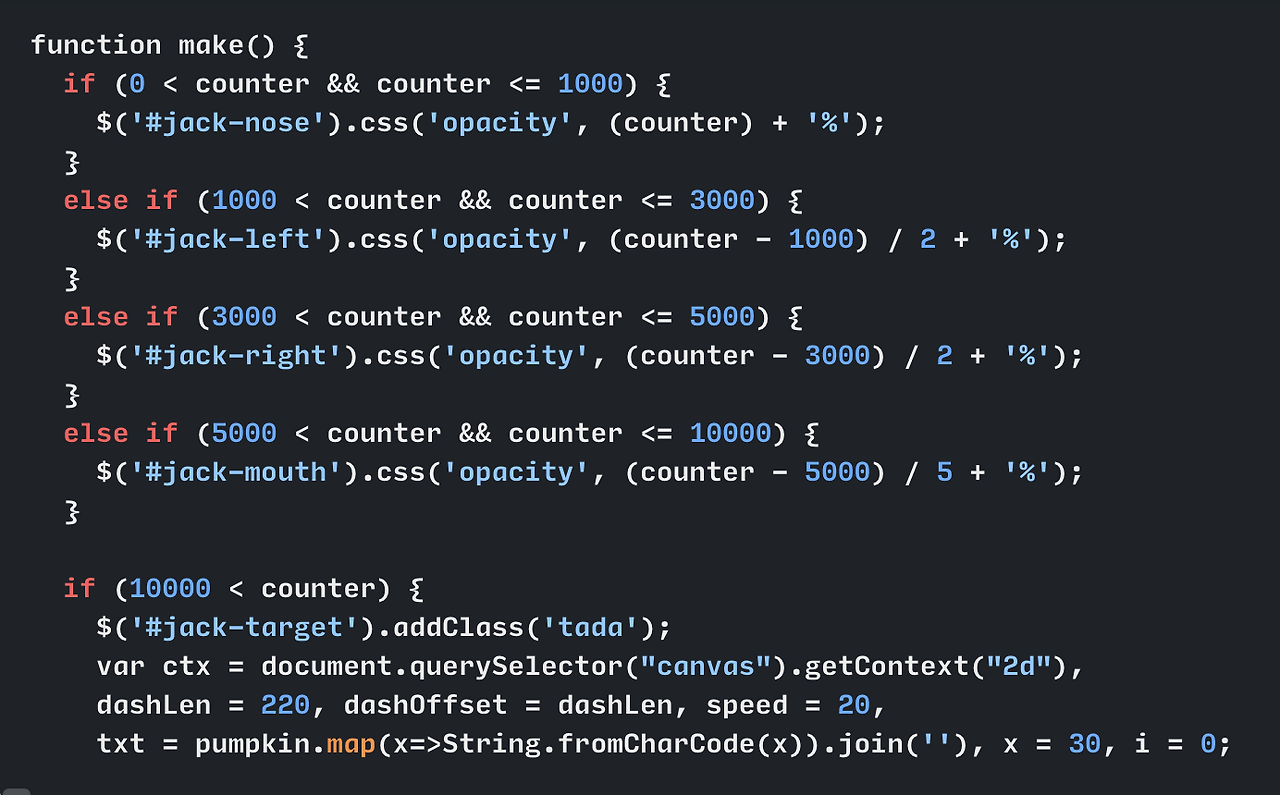 처음에는 감을 못잡아서 counter랑 dashlen 등 건드려보다가 이런 그림이 나왔고, 호박을 계속 클릭하면 그림이 계속 바뀌는 걸 확인했다.