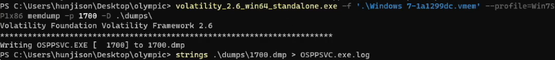 단서: 악성코드가 들어 있던 첨부파일은 엑셀(.xlsx) 형식임. 따라서 오피스 관련 프로세스인 OSPPSVC 프로세스 메모리 덤프 진행