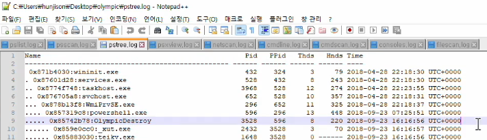 notepad에서 추출한 로그 실행: pstree.log에서 OlympicDestroy 존재