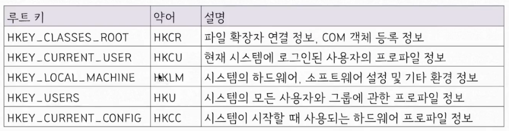 HKEY_CURRENT_USER(HKCU): 현재 시스템에 로그인된 사용자의 프로파일 정보 //많이 사용