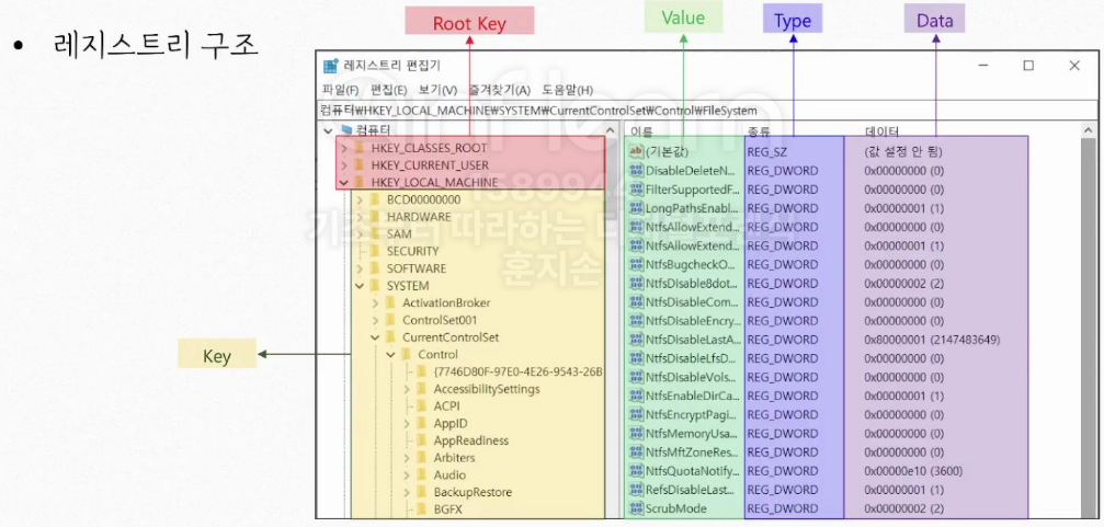 - 윈도우 운영체제와 응용 프로그램 운영에 필요한 정보를 담고 있는 계층형 데이터베이스