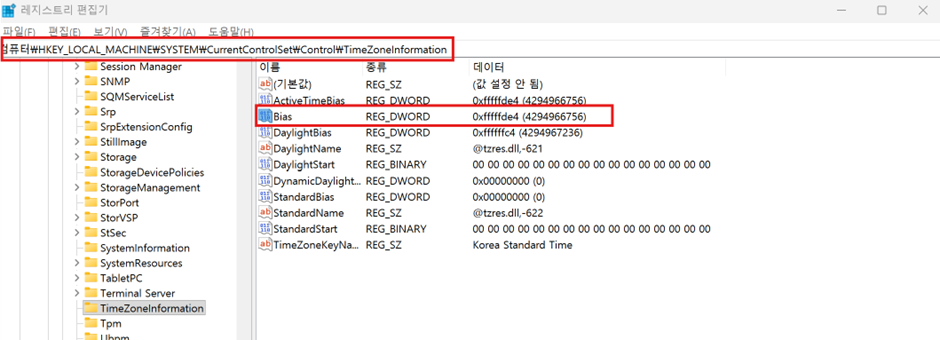 경로: HKLM\SYSTEM\CurrentControlSet\Control\TimeZoneInformation