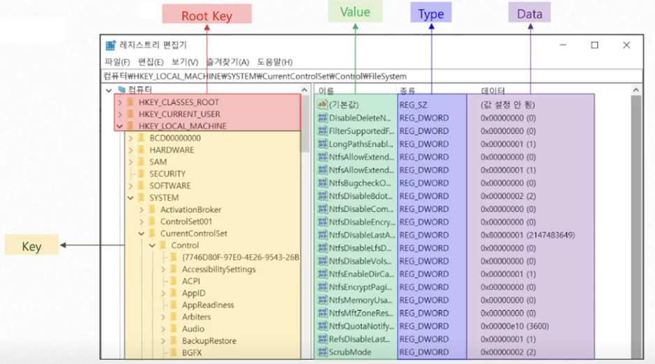 윈도우 운영체제와 응용 프로그램 운영에 필요한 정보를 담고 있는 계층형 데이터베이스