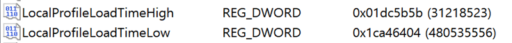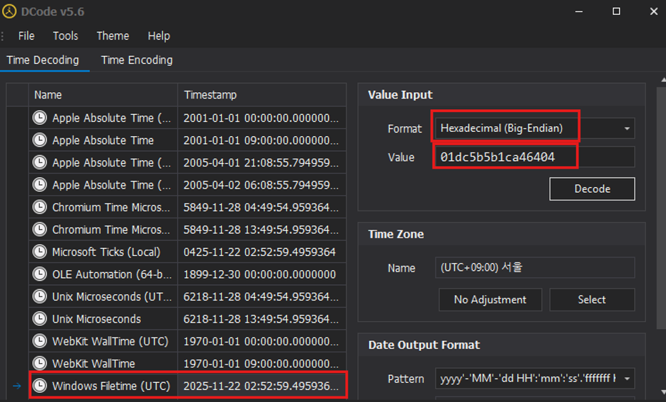 해당 값들을 High + Low 형태로 합친 후 Dcode 프로그램을 통해 입력하면 Windows Filetime에 날짜, 시간이 출력됨