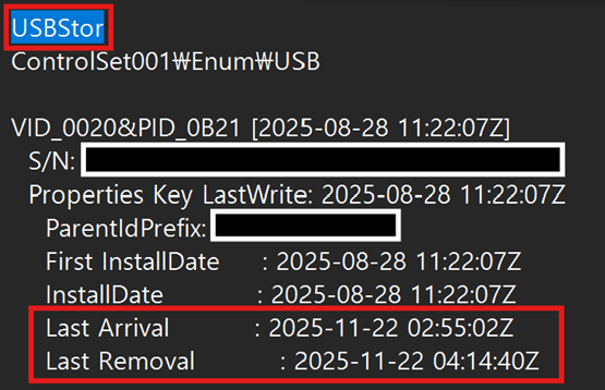 Last Removal: 마지막으로 제거된 시간(USB 연결 종료 시간)