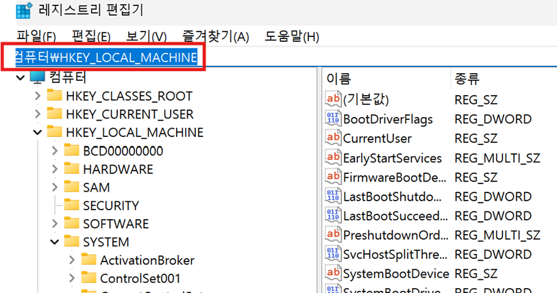 | HKEY_LOCAL_MACHINE | HKLM | 시스템의 하드웨어, 소프트웨어 설정 및 기타 환경 정보 |