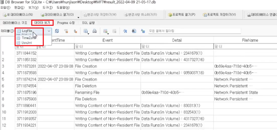 - 파일이나 디렉토리 생성, 수정, 삭제, MFT 레코드 변경 등