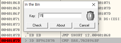 입력 값이 EAX 값이라는 추측을 확실히 하기 위해 CMP 명령에서 브레이크 포인트를 걸고 프로그램을 실행시킨다.
