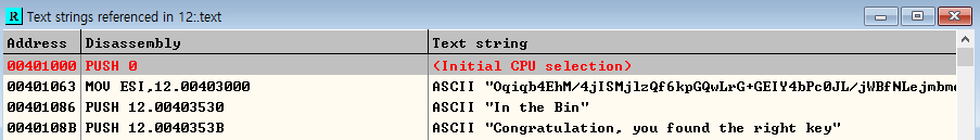 올리디버거에서 Search for > All referenced text strings를 클릭하여 코드에서 참조되는 문자열 목록을 확인한다. 성공 메시지가 있는 위치로 이동한다.