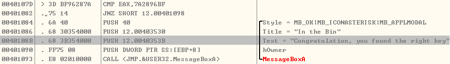 성공 메시지 위쪽을 보면 EAX와 7A2896BF를 비교하는 CMP 명령이 있다. EAX에서 7A2896BF를 빼서 0이 나와 JNZ 명령에서 점프하지 않고 다음 명령을 실행한다. 만약 0이 되지 않으면 JNZ 명령은 401098로 점프할 것이다. 그렇다면 EAX의 값은 7A2896BF가 된다. 하지만 7A2896BF는 16진수이므로 10진수로 바꾸면 2049480383이 된다. 그리고 처음 실행화면의 입력값이 EAX 값일 것이라고 추측할 수 있다.
