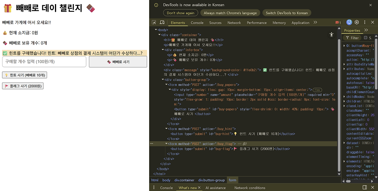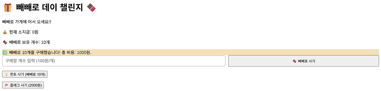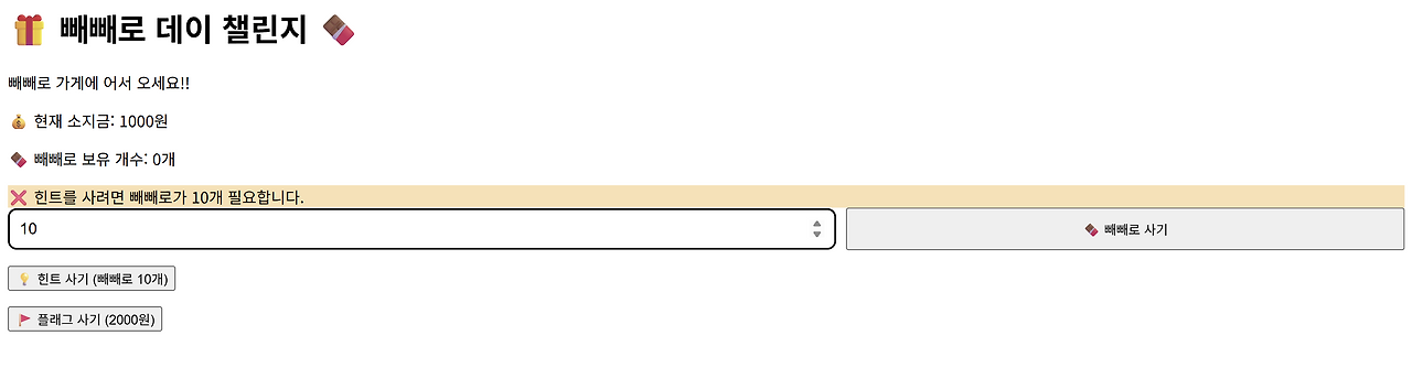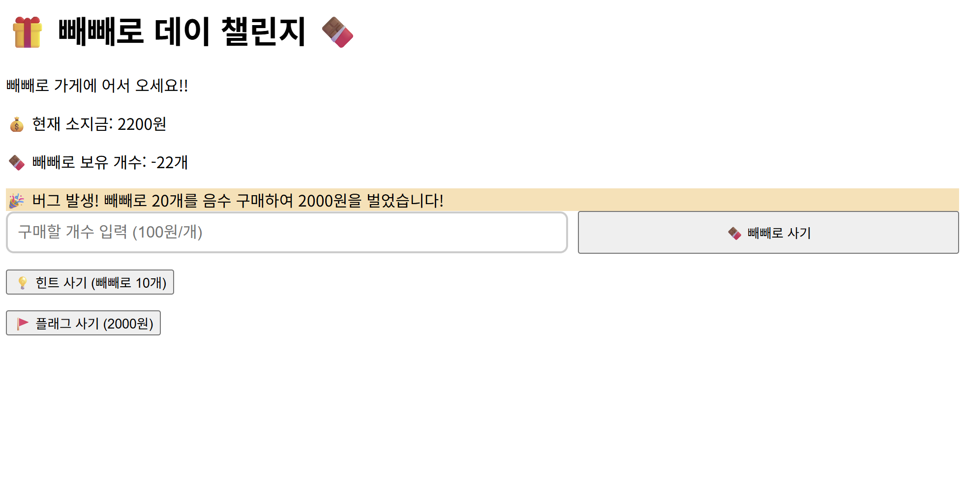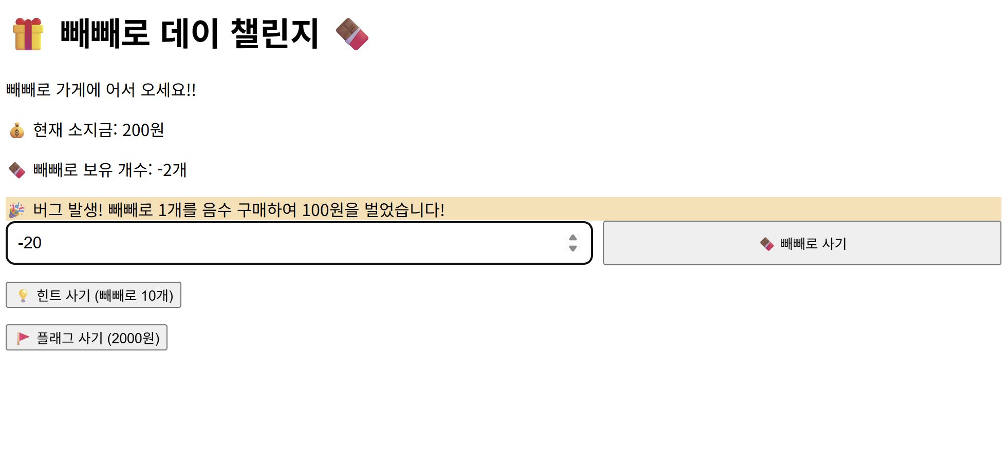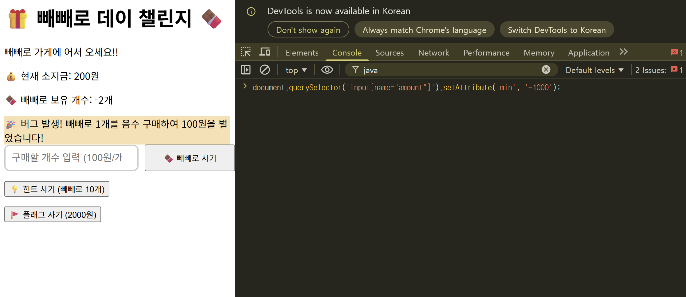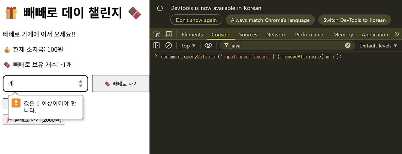 같은 코드를 콘솔창에 입력하고 엔터누르면 빼빼로를 음수만큼 살 수 있게 된다.