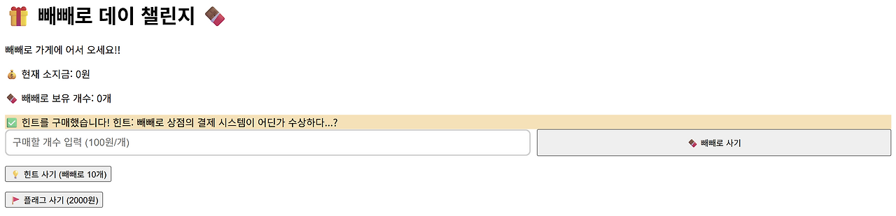 같은 코드를 콘솔창에 입력하고 엔터누르면 빼빼로를 음수만큼 살 수 있게 된다.