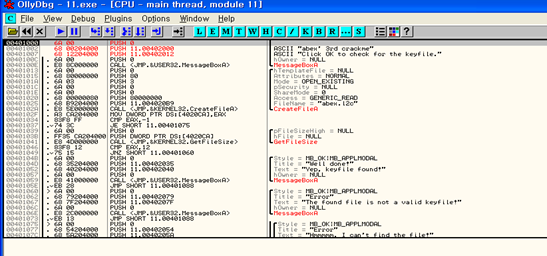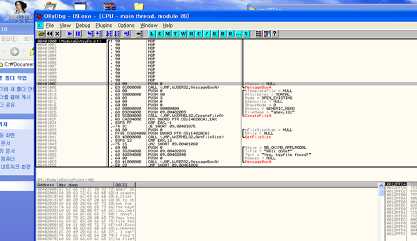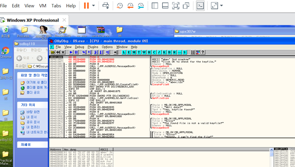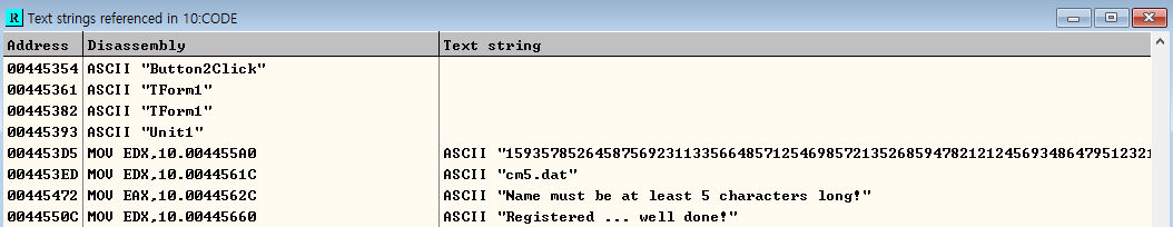 올리디버거에서 Search for > All referenced text strings를 클릭하여 코드에서 참조되는 문자열 목록을 확인한다. 성공 메시지가 있는 위치로 이동한다.