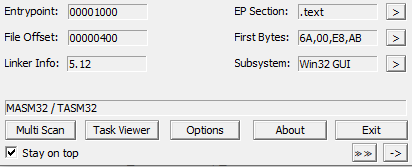 언패킹 전에 패킹된 파일을 살펴본 결과 OEP로 점프하는 부분에 break point를 걸고 실행한 결과 MessageBox 함수 호출에 필요한 인자들이 스택에 push되고 있는 것을 확인. 이 push 되는 인자들이 stolenbyte임을 확인