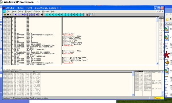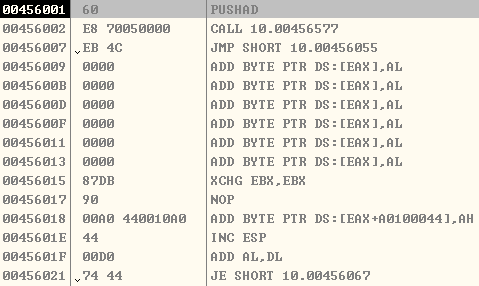 10.exe 프로그램을 올리디버거로 실행하면 PUSHAD라는 문자열을 확인할 수 있다. PUSHAD 명령은 범용 레지스터에 저장된 값들을 스택에 저장하는 명령어입니다. 현재 레지스터 값을 스택에 저장하고 원본 코드로 복구한 다음, POPAD 명령을 이용해서 원래의 레지스터 값으로 되돌립니다.