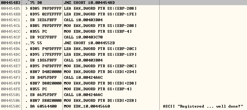 등록 성공으로 가는 분기점 바로 위에 JNZ 명령을 발견했다. 해당 코드의 OPCODE는 75 55이다.